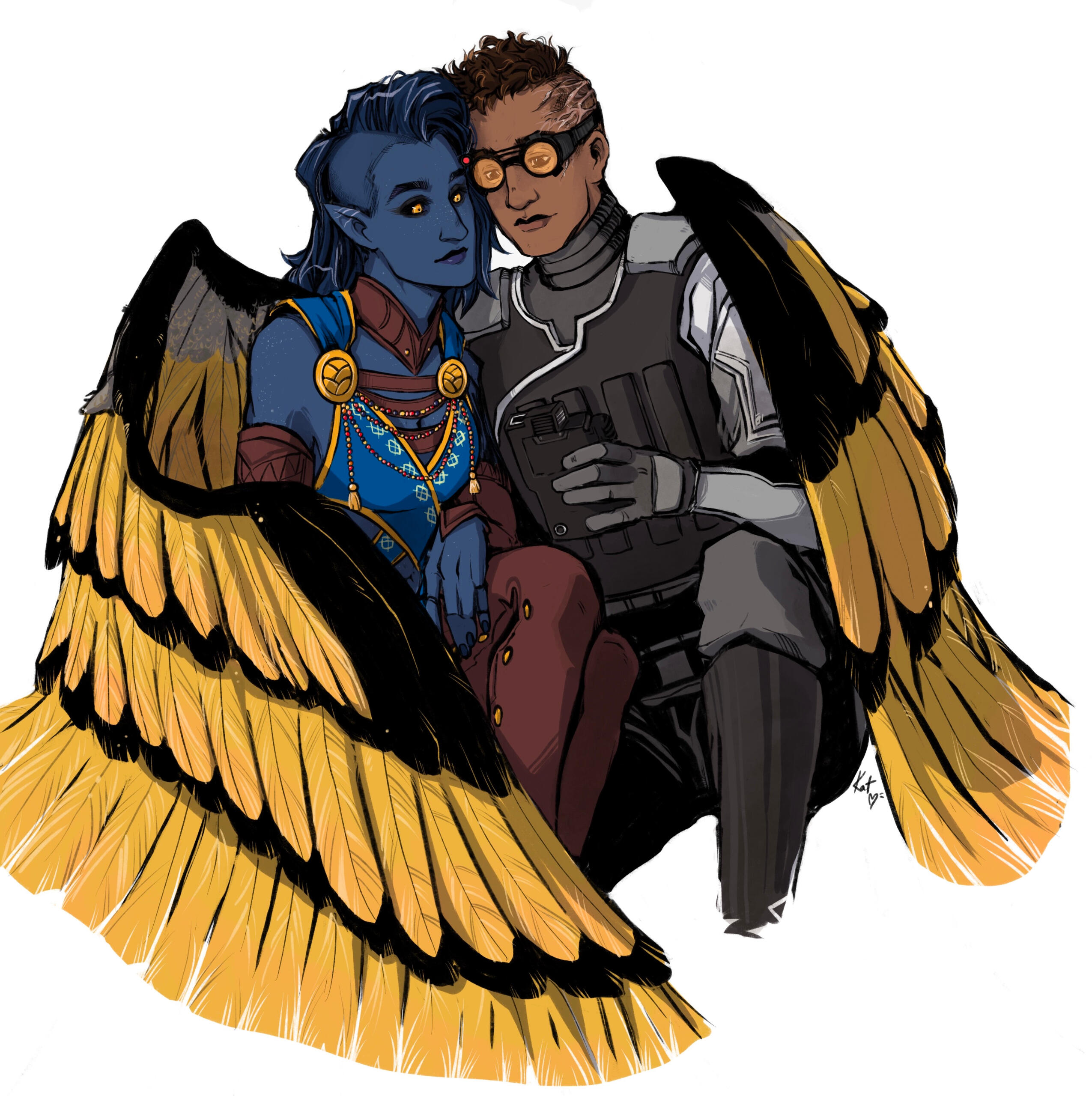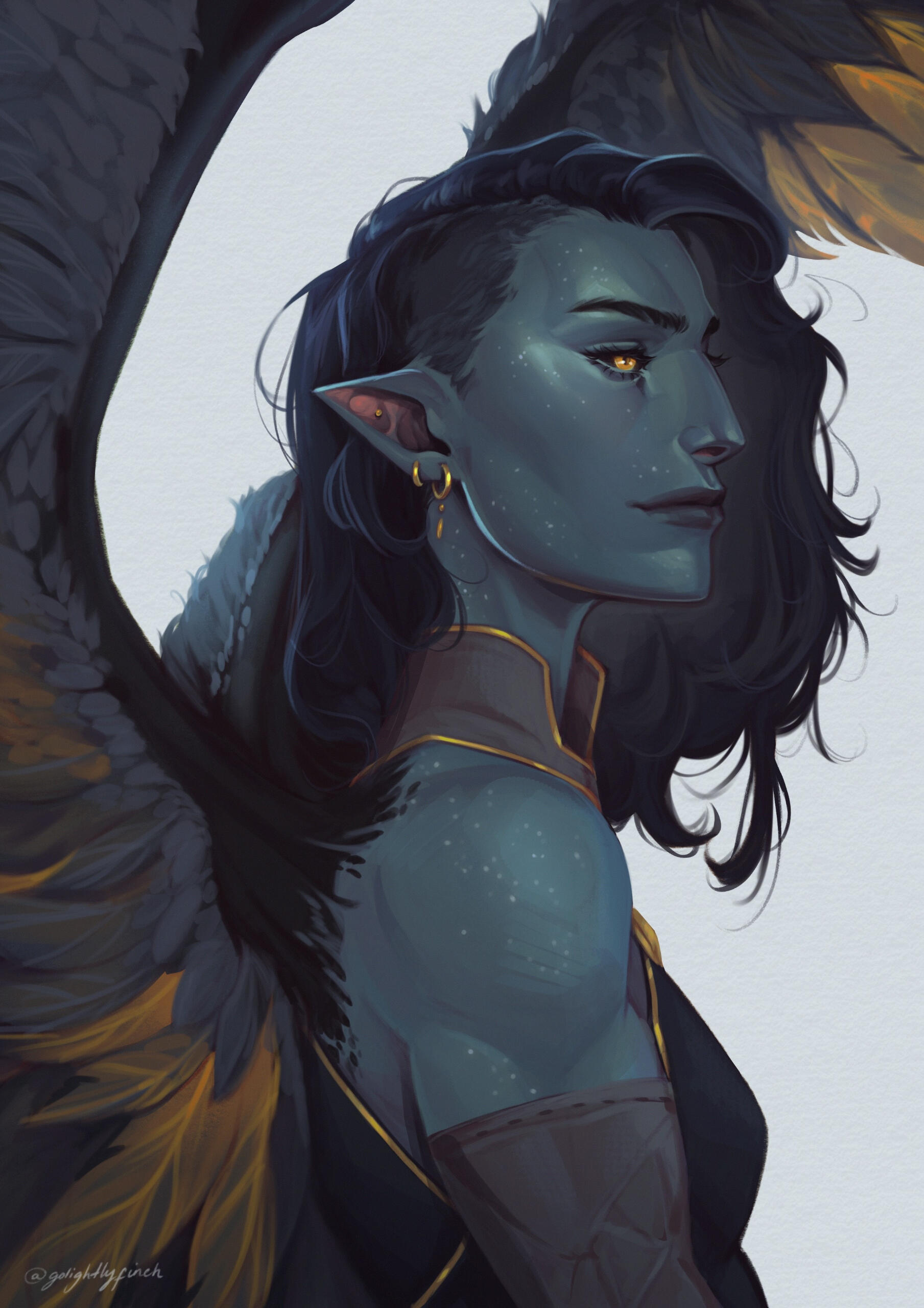 On the fourth of ‘January’, 52 BBY, Ashyra Blake is born to Trygve and Revna Blake, in a remote village. She inherited her fathers wing colours and hair, and her mother’s eyes and facial features. Very early on, her parents realised she was a sensitive child with a very curious mind.She had a difficult time making friends and so kept much to herself, indulging in fantasies of visiting alien worlds, especially when her parents told her about how the Carduls were discovered by the rest of the galaxy. Ash developed a fear and dislike of slavers and pirates already as a child, thanks to her father’s rather vivid storytelling about Cardulia's neighbours.As she entered her teenage years, her parents started to involve her in their chores as well as properly learning how to survive on her own. Ashyra was more interested in flying around and shooting things with her bow; wishing nothing more but to adventure out in the galaxy.An invasion force of hikarens - dark force creatures with red eyes that emerge randomly on the planet every decade for just one night - enters the village of Steinnlundr and slaughters everyone in it, including Ash’s parents in 35 BBY.Before dying, her parents locked her in the pantry of their house. As the monsters try to break into the pantry, Ash attempts to escape through a window, only to make the room collapse on itself, burrowing her under the rubble. While the hikarens give up and disappear as the sun rises, Ash is trapped under the rubble, unable to move, with only her dead parents for company.Hours pass before someone finds her; a traveller who happened to come by and realised something awful had happened. Raud Ternor digs her out of the rubble, helping her recover for a few days. Realising that the 17 year old girl is woefully incapable of taking care of herself, he takes it upon himself to teach her.After some time, Raud ends up outright adopting her, becoming her step-father. For eight years he teaches her, making her a warrior. While she’s haunted by her parent’s deaths, having developed a fear of closed spaces as a result of being trapped in the rubble, she’s determined to never again be helpless in a dangerous situation. Ash becomes very serious and closed off during this time, rarely smiling or indulging in more relaxed activities, despite Raud trying to make her sometimes.