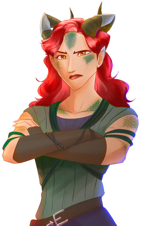 HAKON.Hakon is a 6' cardul with dark purple, wavy hair and green eyes. His skin is a light blue hue, while his wings are black and orange.He always wears his black leather jacket, along with a comfortable shirt, trousers and boots in brown colours, with no accessories. As for weapons, two blasters does the work for him, as well as grenades when the need calls for it. While he's decently skilled in melee combat, he prefers to avoid that; utilizing his wings and agility to avoid most close combat.This is a man with high charisma but low wisdom. A liar, a flirter and someone who thinks the worlds owe him everything. He's very assured that his quick tongue can win him any situation. If that doesn't work he'll use his weapons or dirty methods to get what he wants. In worst cases, he expects the Durands to bail him out.
